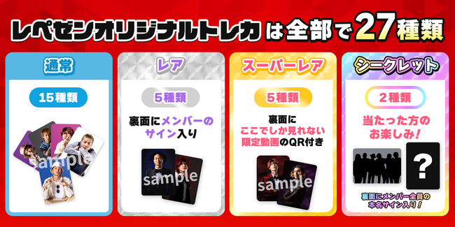 トレーディングカードは全27種類。ノーマル・レア・スーパーレアのほかシークレットカードもあり、スーパーレアカードではここでしか手に入らない限定動画を見ることができます。