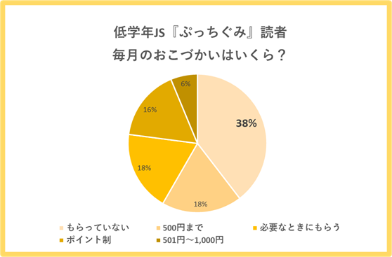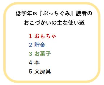 昨年の「ぷっちぐみ」2022年6・7月号と「ちゃお」2022年6月号にて掲載、収集した「BIGアンケート2022」内で実施した「おこづかい」に関するアンケート結果も、今回はJSのマネー事情として併せて公開!毎月のおこづかいは「もらっていない」子がほとんどでした。また「ポイント制(お手伝いをしたらもらえるなど)」という回答も多く、その使い道からも、欲しいものはお年玉や日頃のおこづかいを大切に貯金しながら手にいれたいと考えているのかもしれません。