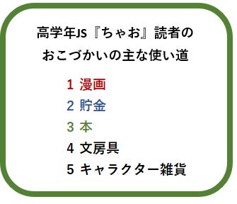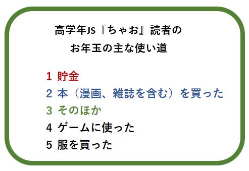 ちゃおっ娘は実は堅実派。お年玉はすぐに使ってしまうのではなく、一度貯金し、何か欲しいものがあったときに貯金を下ろして購入するというように、親御さんとの約束がしっかり出来ている気がします。さらに学校の勉強にも真正面から取り組んでいる姿が浮き彫りになりました。今年はみんな「お勉強を頑張る!」ということなので、読めば頭の良くなるコミックなどを企画していこうと思っています!