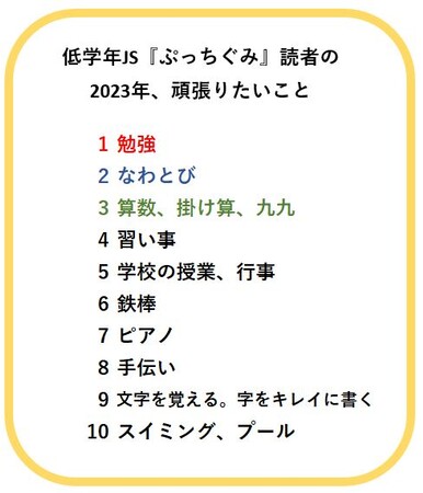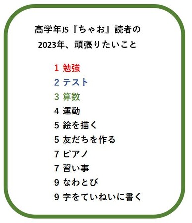 小学館『ぷっちぐみ』と『ちゃお』による「JS研究所」トレンド調査女子小学生(JS)が「2023年に、“がんばりたいこと”」ランキング発表。努力家な子が多い! 第1位は“勉強”