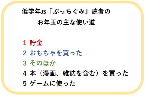 がんばりたいこと1位「勉強」、2位「なわとび」という結果は、例年通りでした。なわとびはいろいろな飛び方を練習しているようですし。3位の「算数」に関しては、苦手意識のあるお子さんが多い中、それでもがんばりたいという努力型な姿勢が多く見受けられました。お年玉の使い道では「貯金」が1位に上がっているのは編集部でも驚きました。3位の「そのほか」の中でも“(お年玉を)親に預けた”という意見が多く、1位「貯金」と同意見で、玩具などを買うという消費行動より、将来のために貯蓄するという意識高い結果となりました。努力型で賢いお子さんが最近は特に多いなあ、と思います。日本社会の堅実さ、各家庭内の空気感を敏感に反映しているのではないでしょうか。
