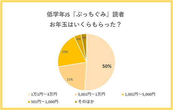 2023年のお年玉金額は学年問わず「1万円以上〜3万円未満」が多数。低学年JSでは5割、高学年JSでも4割以上の子たちが1万円以上のお年玉をもらったことがわかりました。