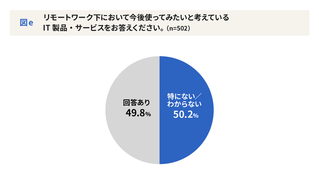 それでは「今後使ってみたいIT製品またはサービス」について見てみましょう。50.2%と半数の回答者が「特にない、わからない」と答えたことから、ユーザーにとって上記二つ以外にそもそもどのようなツールやサービスがあり、IT化によってどのようなメリットが得られるのかが明確にイメージできていないことが分かります。