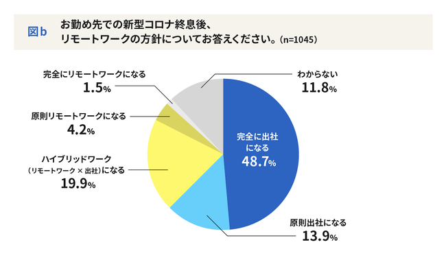 一方で「勤め先での新型コロナ終息後のリモートワーク方針」について尋ねたところ、62.6%の企業が出社の方針(「完全出社になる」48.7%、「原則出社になる」13.9%)を固めているのに対し、25.6%がリモートワークを認める方針(「ハイブリッドワーク」19.9%、「原則リモートワークになる」4.2%、「完全にリモートワークになる」1.5%)という結果になりました。
