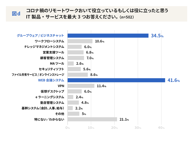 リモートワークで導入が加速化されたITツール。「どれが役に立っているのか」を聞いてみると、多くの回答が「WEB会議システム」と「グループウェア・ビジネスチャット」に寄せられました。手軽で便利ながらも、ユーザーにとって効果を感じやすいこの2つのツールですが、現在では「使えることが前提」のツールになり、今後もより一層の進化を求められそうです。