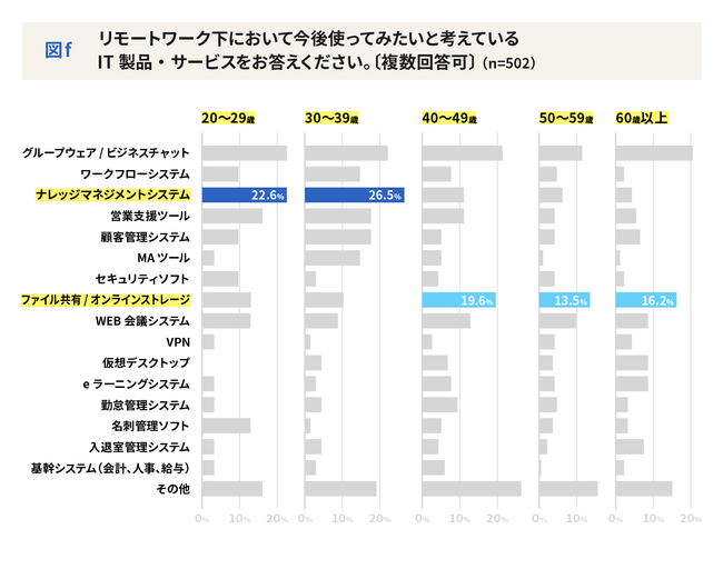 その中で具体的な製品カテゴリーについて回答があった49.8%を世代別にみると、39歳以下の世代で回答第一位が「ナレッジマネジメントシステム」という結果になりましたが、40歳以上の世代で大きく支持を集めたのが「ファイル共有/オンラインストレージ」でした。39歳以下では「知見やスキルなどプロセスの共有」を重要視している一方で、40歳以上では「ファイルなどの成果物の共有」に重きを置いており、仕事に対する世代間の意識差がITツールに反映された結果となりました。