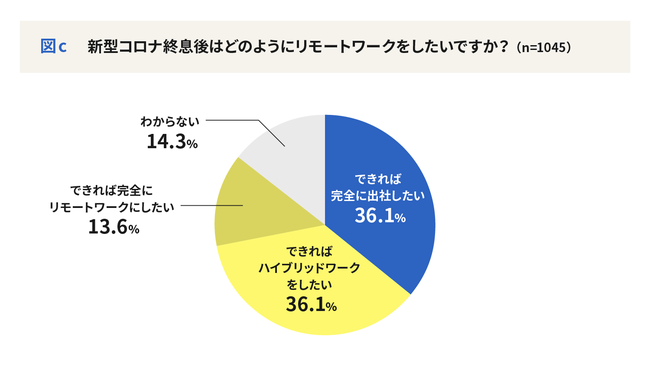 しかし、「新型コロナ終息後はどのようにリモートワークをしたいですか?」という質問では「できればハイブリッドワークをしたい」(36.1%)、「できれば完全にリモートワークにしたい」(13.6%)合わせて49.7%と、「リモートワークをベースとした働き方」を希望した人は約半数に上ったのに対し、「できれば完全に出社したい」と答えた人は36.1%にとどまり、今後について会社の方針と社員の希望の働き方に大きなギャップが生まれていることが判明しました。