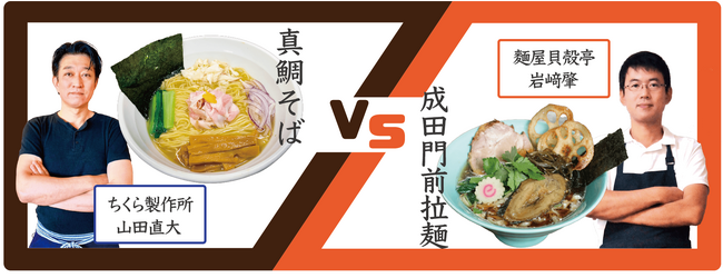 【イベント内容】「らーめん ちくら製作所」は真鯛そばを、「麺屋貝殻亭」は成田門前拉麺を提供します。両者1,000円(税込)で販売し、「スープ、麺、トッピング、全体のバランス」の項目でお客様から評価をいただき(各項目1〜5点/QRコードから投票)、結果は翌日SNSで発表されます。