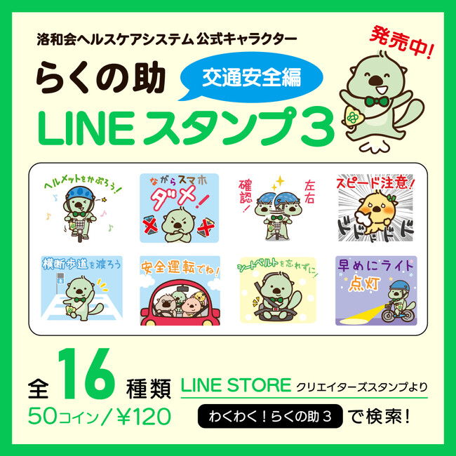 交通安全啓発と社会貢献を強化する洛和会ヘルスケアシステムが、「らくの助」LINEスタンプ交通安全編を発売。売上金は闘病中の子どもたちへの寄付を計画中。