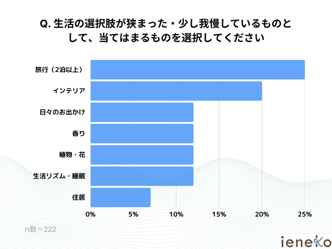 結果:約9割の猫ユーザーが我慢を感じているという結果に。「2泊以上の旅行」「インテリア」は約4割にのぼった。多くのユーザーが猫を飼う前のライフスタイルを継続することが困難な状況がうかがえる。