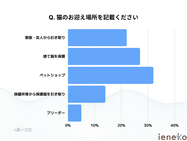 猫のお迎え場所として一般的なペットショップに続き、「捨て猫を保護」・「近しい人間関係からの引き取り」など、猫と暮らすきっかけとなった接点が「偶然性」に伴うかたちも多く見られる。