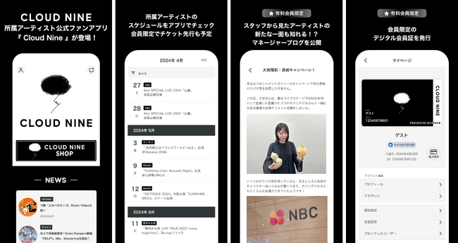 さまざまなアーティストやクリエイターが所属する音楽・芸能事務所であるクラウドナイン。今回のアプリリリースにより、クラウドナインに所属しているすべてのアーティスト、クリエイターの最新情報を得ることができます。また、プレミアム会員はクラウドナイン所属のすべてのアーティストのライブチケット公式アプリ先行への応募が可能となり、各アーティストの担当マネージャーによるマネージャーブログなどのスペシャルコンテンツをお楽しみいただけます。
