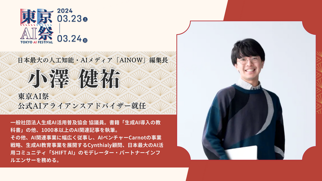 2024年3月23日(土)、24日(日)に渋谷ストリームホールにて開催される「東京AI祭」のAIアライアンスアドバイザーに、AINOW編集長であり一般社団法人生成AI活用普及協会協議員の小澤健祐氏が就任いたします。