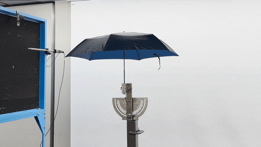 試験では徐々に風速を上げていきます。突発的な風に対しては、傘骨が折れてしまう場合があります。