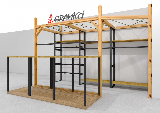 素材に関しては計画的に育林・伐採された柱材や、成長が早く短期的に再生する小径木を無駄なく利用して生産されたパネル材などを使用しています。木材の節や割れなども自然素材の特性として認め、デザインの一部として組み込むことで「GRAMICCI」というブランドの持つアウトドアのイメージを表現しました。製作に関しては木部、金属部分、サインなどのいずれも小規模な工房で様々な専門の職人の手により製作しています。また通常のポップアップのように什器単体や既存スペースを利用しただけでなく櫓を建て占有のスペースを設ける事でブランドの世界観がより伝わりやすくなるようにしました。さらに随所にはカラビナやロープなどのエレメントを散りばめることで感覚的にも「GRAMICCI」のブランドコンセプトを理解いただけるようにデザインしています。