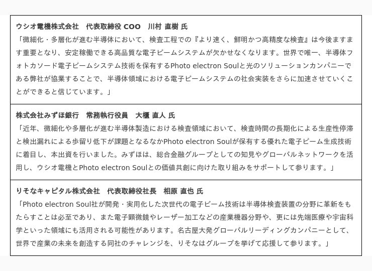 今回、Photo electron Soulは、ウシオ電機から出資を受けるとともに、Photo electron Soulが取り組んでいる半導体検査向け事業に対して量産リソース(ファシリティー・人材・量産技術等)および販売リソース(拠点・ネットワーク・人材等)の協力を受けます。また、みずほ銀行からは出資を受けるとともに、Photo electron Soulの急速な事業成長を裏打ちする「企業体としての成熟」のためにファイナンス機能強化やガバナンス体制整備等への支援を受けます。