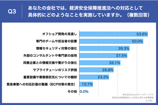 Q2で「十分にできている」「ややできている」と回答した方に、「Q3.あなたの会社では、経済安全保障推進法への対応として具体的にどのようなことを実施していますか。(複数回答)」(n=56)と質問したところ、「オフショア開発の見直し」が53.6%、「専門のチームや担当者の設置」が50.0%、「情報セキュリティ対策の強化」が39.3%という回答となりました。