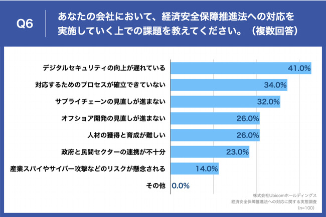 「Q6.あなたの会社において、経済安全保障推進法への対応を実施していく上での課題を教えてください。(複数回答)」(n=100)と質問したところ、「デジタルセキュリティの向上が遅れている」が41.0%、「対応するためのプロセスが確立できていない」が34.0%、「サプライチェーンの見直しが進まない」が32.0%という回答となりました。
