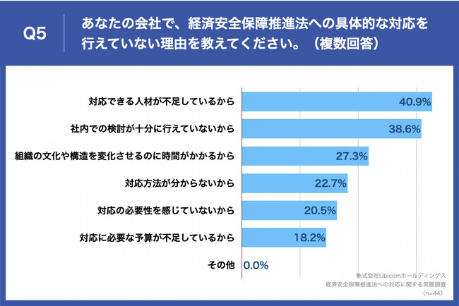 Q2で「あまりできていない」「全くできていない」と回答した方に、「Q5.あなたの会社で、経済安全保障推進法への具体的な対応を行えていない理由を教えてください。(複数回答)」(n=44)と質問したところ、「対応できる人材が不足しているから」が40.9%、「 社内での検討が十分に行えていないから」が38.6%、「組織の文化や構造を変化させるのに時間がかかるから」が27.3%という回答となりました。