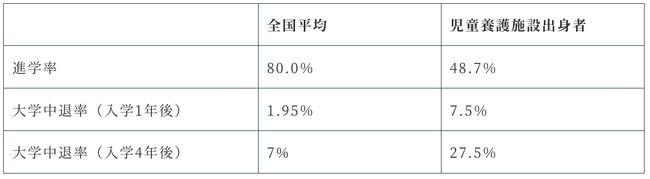 「全国児童養護施設 退所者トラッキング調査 2023」(認定 NPO 法人ブリッジフォースマイル)・「学生修学状況(中退者・休学者)等に関する調査(文部科学省)」によると、児童養護施設出身者の高校卒業後の大学進学率は48.7%と、全高校卒業者(約99万人)の進学率が約80%であるのに対し、大きな差があります。また、児童養護施設出身者の大学中退率は、入学1年後で7.5%、入学4年後で27.5%と高い水準にあります。