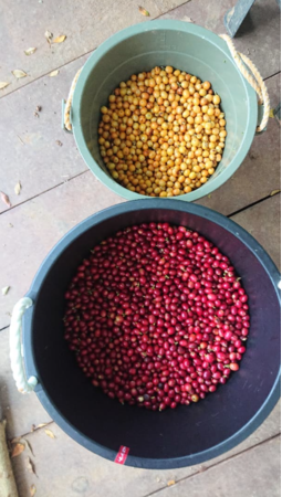 写真は下の赤い実が『ティピカ種』上の黄色が『イエローブルボン種』です。