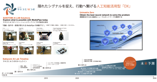 派生サービスとして「UnimatrixZero」を用いて、データから隠れたシグナルを捉えて行動へ繋げるための人工知能活用型の「DX」支援を提供しています。 本年度からは、人工知能によるマーケティングツール「Kiitos」をはじめとするオリジナルサービス開発に関しても取り組みを拡大する所存です。