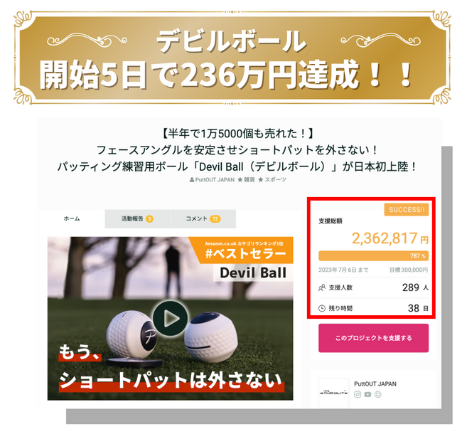 パッティング専門ブランド『PuttOUT』から新商品デビルボールが日本初上陸!5/25(木)クラウドファンディングをスタート!2日で200人以上の支援で167万円を突破!
