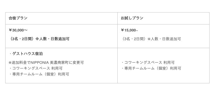 法人の皆さまに経営・開発・チーム合宿、研修、部署・チーム単位でのリモートワーク等でお気軽にご利用頂くべく、以下2つのプランを受付開始いたしました。