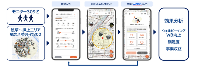 本実証では 309 名のモニターが、観光アプリ「NOSPOT」が推奨する台東区・墨田区(浅草~押上エリア)のスポットを訪れ、得られた満足度を評価しました。行動データと実証後に実施したアンケート結果を分析したところ、以下の可能性が示されました。