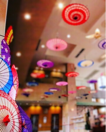 ホテル入口から館内に入ってすぐ目に留まるホテルロビーを、約50本の和傘を用いて彩りました。吹き抜けを使用し、色とりどりの和傘を用いたアンブレラスカイでお客様をお迎えします。