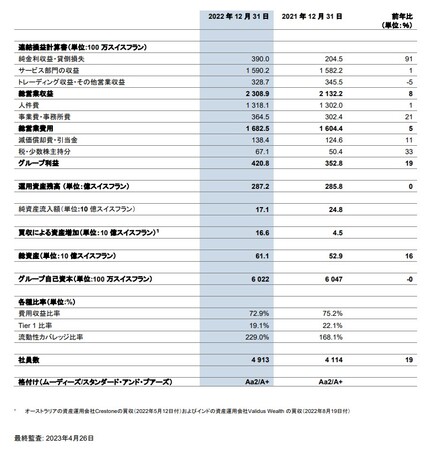 2022年のサービス収入は、顧客活動が低調だったにもかかわらず、15億9,000万スイスフランと安定的に推移し、仲介手数料と成功報酬は2021年の好業績をわずかに下回りましたが依然として高水準を維持しています。純金利収入は、長引くマイナス金利環境の終焉を受けて顧客預金が大幅に増加したことが反映され、3億9,000万スイスフランまで大きく回復しました。トレーディング活動による収入やその他の営業収入は下半期に回復し、通年で前年比5%減の3億2,870万スイスフランとなりました。全体として、総営業収益は8%増の23億1,000万スイスフランでした。