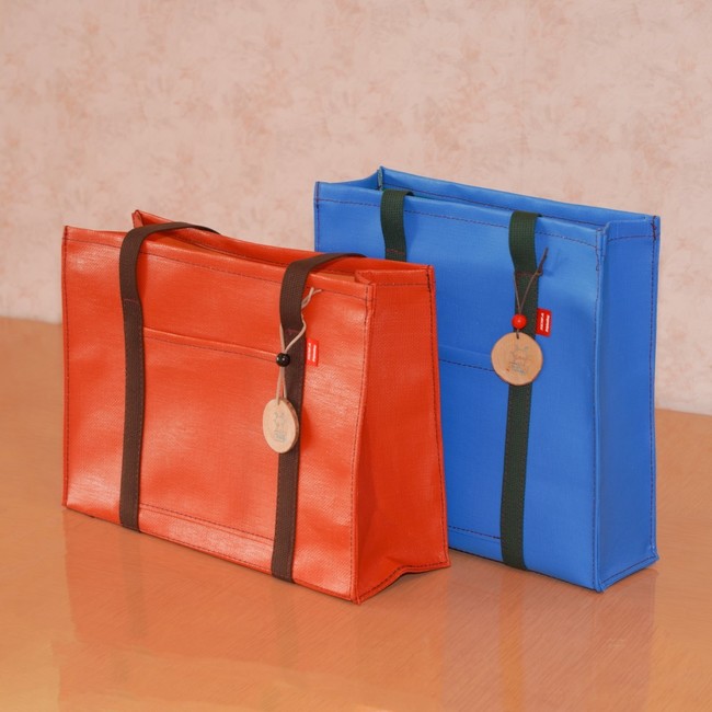 はしっこBagはフレキシブルコンテナバッグのはしっこを生地にしており特徴は色彩豊かで耐久性に優れていること。そして軽くて丈夫であり劣化に強く防水のため災害時には水を入れて運ぶことも可能です。