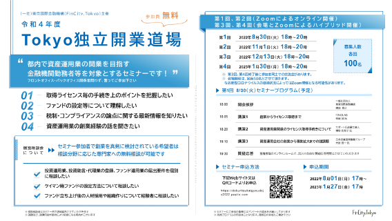 一般社団法人 東京国際金融機構(本社:東京都中央区、会長:中曽宏)(以下「FinCity.Tokyo」)は、資産運用業者向けの独立開業支援セミナー「令和4年度Tokyo独立開業道場」(全4回開催)の第2回を、11月1日(火)にオンラインにて開催いたします。