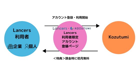 『Lancers』利用者様は、専用に用意された「Kozutumiアカウント登録画面」から『Kozutumi』を利用開始することで正式ローンチまで完全に無料利用可能です。また、『Kozutumi』の正式ローンチ後に有料利用する際に1ヶ月目がさらに無料となります。キャンペーン情報は、Lancersユーザー様向けに配信予定です。