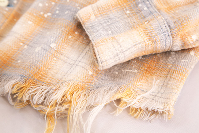 チェック生地のカラーリングがサックス×オレンジの春夏らしい爽やかな色合いのため、激しい加工も上品で柔らかな雰囲気に仕上がっています。