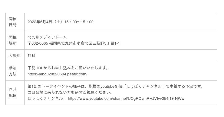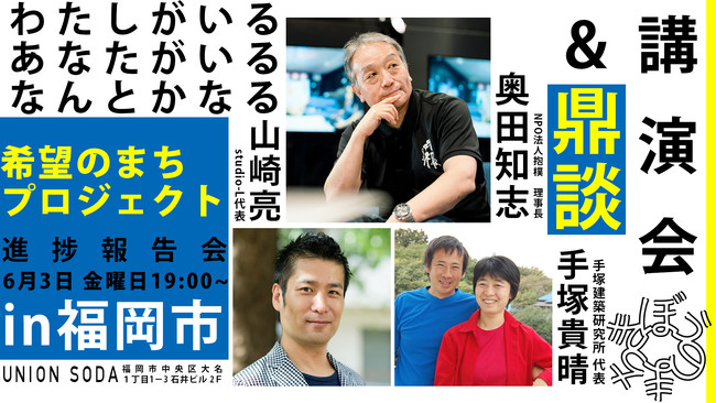 NPO法人抱樸が現在取り組んでいる「希望のまちプロジェクト」の進捗報告会が福岡市と北九州市で開催されます。2022/6/3(金)19:00〜21:00には福岡市中央区大名のUNION SODAでトークイベントを開催。2022/6/4(土)13:00〜には北九州市小倉北区の北九州メディアドームでトークイベントおよびライブパフォーマンスが行われます。トークイベントのゲストは両日とも、希望のまちの設計に関わる手塚建築研究所代表の手塚貴晴氏と手塚由比氏、またコミュニティデザインに関わるstudio-L代表の山崎亮氏です。抱樸では、多くの方の参加を呼び掛けています。