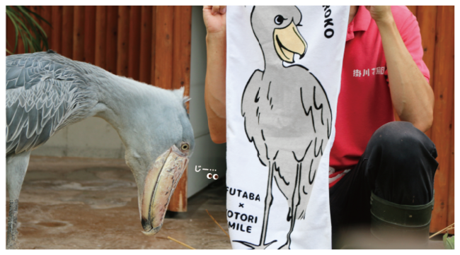 今回、コラボ商品のモデルに選ばれた「ハシビロコウのふたばちゃん」は、今や「動かない鳥」「コワモテの謎の鳥」としてインターネットでも大人気。特徴的な大きなくちばし&鋭いまなざし、意外と穏やかで愛情表現豊かな性格のギャップにハマる人が続出中の「掛川花鳥園」の人気者です。