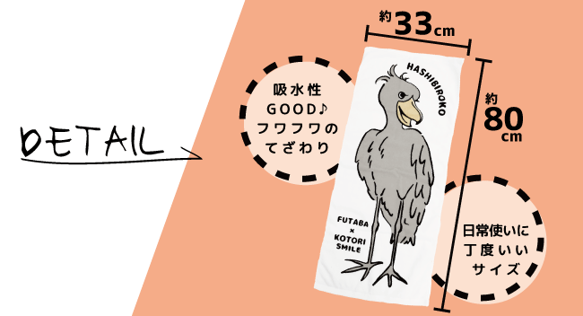 掛川花鳥園のツンデレプリンセス、ハシビロコウの“ふたばちゃん”をモチーフにしたフェイスタオル。