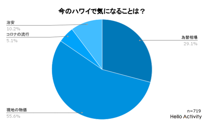 「今のハワイで気になること」に関しては、「現地の物価」55.6%、「為替相場」29.1%と、金銭面の心配が圧倒的に大きいことがわかりました。ただ、「為替相場」よりも「現地の物価」との回答が多く、円安への懸念は昨年よりは薄まっているようです。また、「コロナの流行」との回答は5.1%にとどまり、現在のハワイ旅行へのハードルは新型コロナウイルスではないことが確認できました。