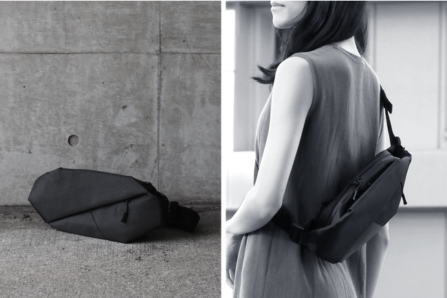 ボトルをイメージした特徴的なデザインは、片掛けしたり、腰に巻いてウエストポーチ風に使用してもおしゃれに持つことができます。また、フロントポケットのファスナーは本体に対し斜めにすることで、幅のあるものでも出し入れしやすく、利便性も兼ね備えたデザインになっています。