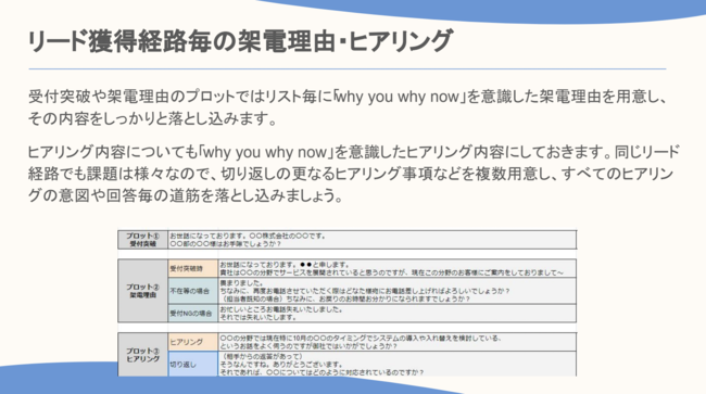 「強いインサイドセールス組織を作るオンボーディング施策」のスライドでは、「業界・商材知識」「使用ツール」「トークスクリプト」「ロールプレイング」など、インサイドセールスのオンボーディングや教育を行う際にメンバーへ落とし込むべきポイントや仕組みをまとめたスライドになります。