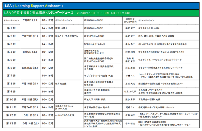 東京都港区の認定NPO法人エッジ(会長:藤堂栄子)は、子どもの特性や発達に応じた支援方法を学べる「LSA(学習支援員)養成講座 スタンダードコース」を7月8日に開講します。