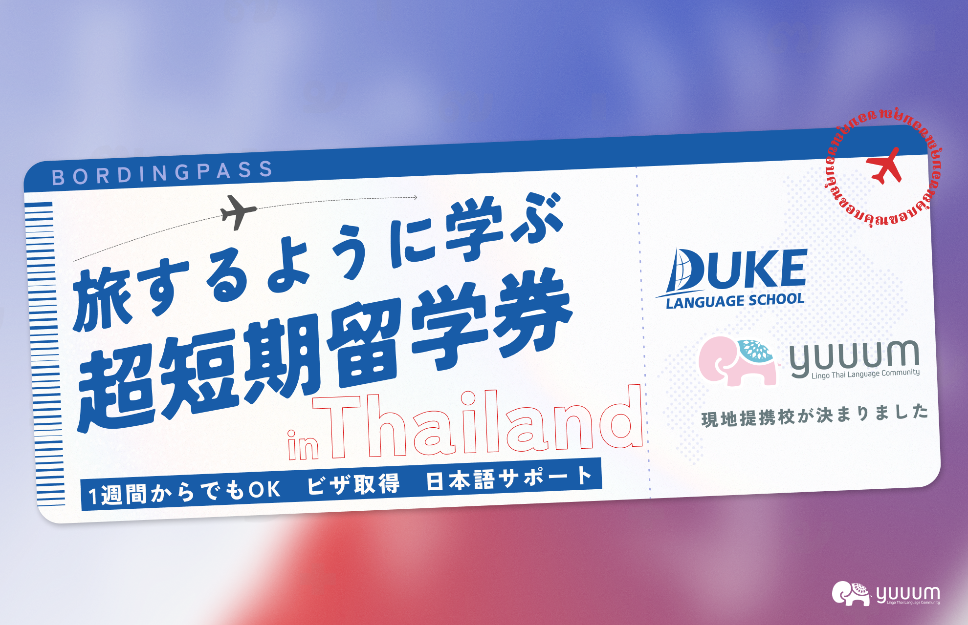 株式会社YUUUM(本社:東京都新宿区、代表取締役:土山結実香、以下 YUUUM)は、この度、タイ・バンコクの語学学校 DUKE LANGUAGE SCHOOL(デューク・ランゲージ・スクール、以下 DUKE)と提携を締結し、日本人向けのタイ語短期留学プログラムの提供を開始します。