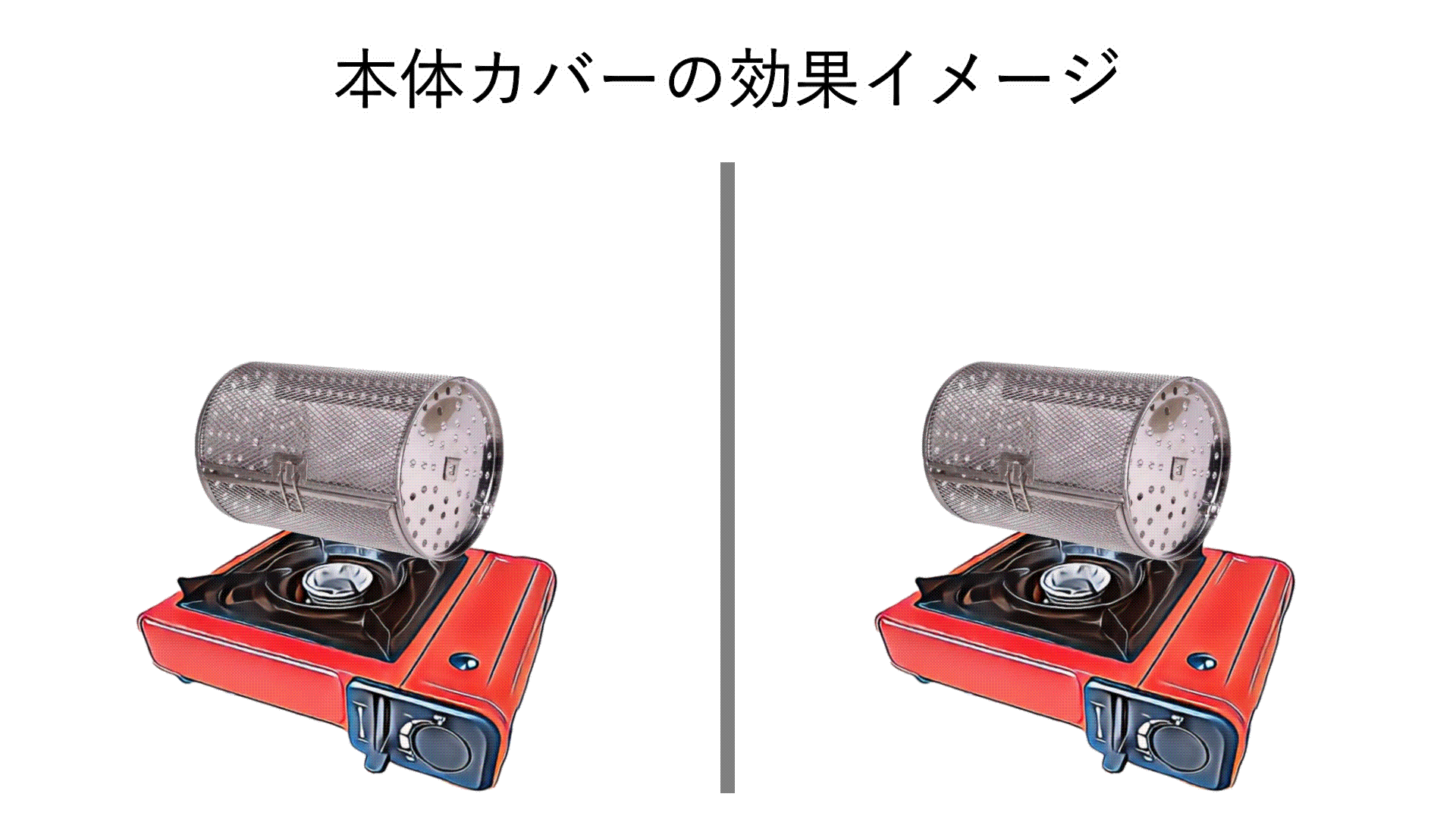 本体カバーは熱を閉じ込めるため、カセットボンベ1本で約10回の焙煎が可能です。省エネ効果あり。