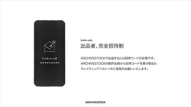 昨今のオンライン古着市場における不正取引や贋作品の流通事情等を踏まえ、ARCHIVESTOCKでは〈招待コード〉をお持ちの方のみがアイテムを出品・販売することができる仕組みとなっています。