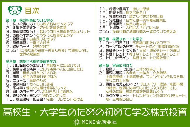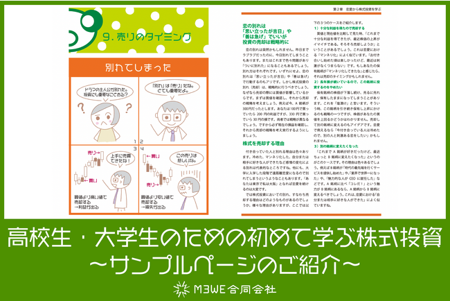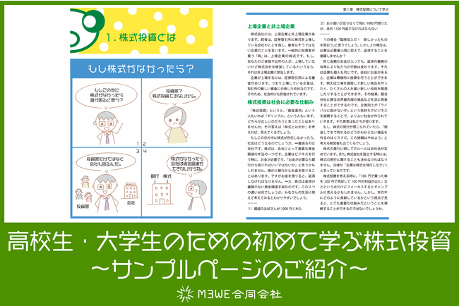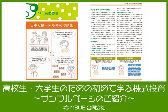 M3WE合同会社(本社:東京都中央区、代表:盛田 祐代)では、8月上旬に「高校生・大学生のための初めて学ぶ株式投資」(投資ノート付き)を出版します。本書は、株式投資に興味を持つ高校生及び大学生を対象にした投資の入門書です。老後に向けた資産形成を目的とするだけではなく、投資で得た情報を就職や起業に活用する点にまで踏み込んだ新しいタイプの投資の本です。