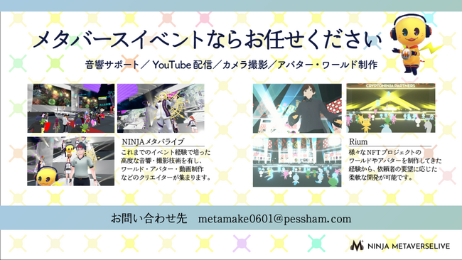 NINJAメタバライブはこれまでのイベント経験で培われた、高度な音響技術を有しています。またアバタークリエイター、ワールドクリエイター、YouTube同時配信やカメラマン撮影、動画パフォーマンスなど、高度なクリエイターが集まっています。これまでレゲエミュージシャンの三木道三氏、SABOTENのキヨシ氏などのご出演、演歌歌手の八代亜紀氏のコンサートの配信サポート等の実績があります。