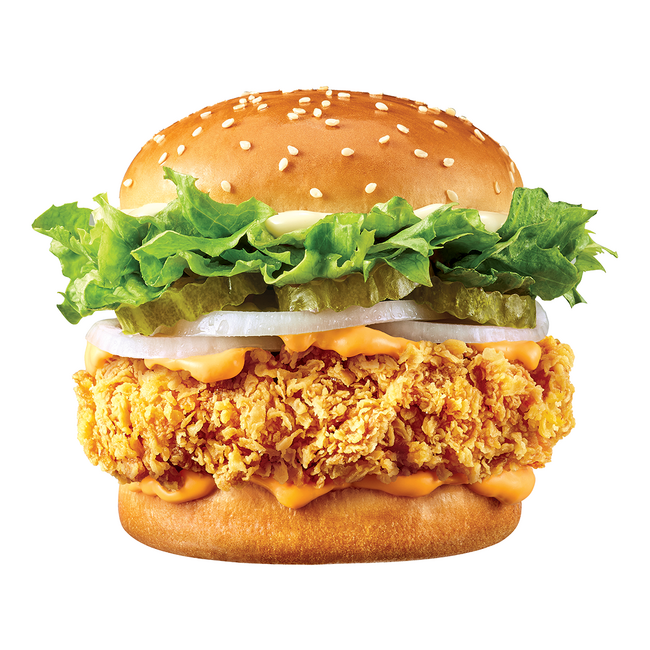 チキンが2倍!アメリカンチーズ、サクサクのレタス、トマト、ピクルス、タマネギがトーストしたバンズに乗った、チーズソースとママのドレッシングがたっぷりかかった贅沢バーガー。味わい豊かでボリューム満点!