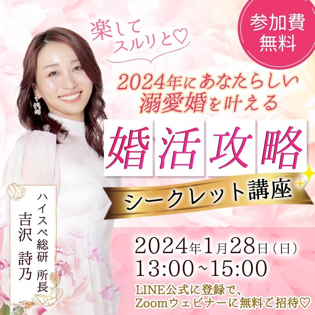 ハイスペ男子総合研究所は、1月28日(日)に2024年にあなたらしい溺愛婚を叶える婚活攻略シークレット講座を開催いたします。婚活のコツやあっという間にマインドや男性の関係が変わる、意外なポイントもご紹介いたします。