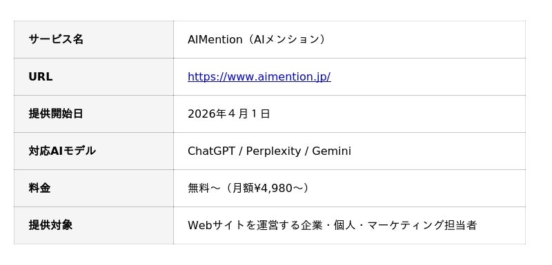 ChatGPT・Perplexity・GeminiへのAI引用を自動計測する国産SaaS「AIMention(AIメンション)」2026年4月1日サービスローンチ決定。先行リリース通知受付を開始。